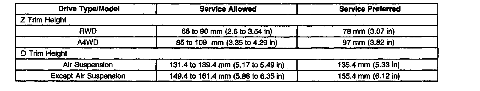 Ride/Trim Height Specifications