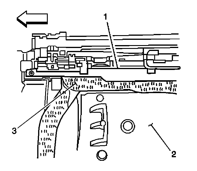 5. Flex the center of the sunshade (2) upward while simultaneously sliding the panel sideways to release the retaining tabs (3) from the track slot (1).