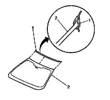 Important: The windshield lower supports (1) have molded in locks with an adhesive strip (2) on the back side. Once the windshield lower stop have been removed they must be replaced.