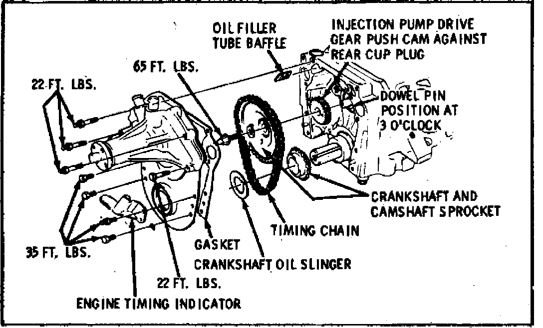 5. Remove remaining front cover attaching bolts and the front cover. Also, remove the dowel pins. It may be necessary to grind a flat on the dowel pin to provide a rough surface for gripping.