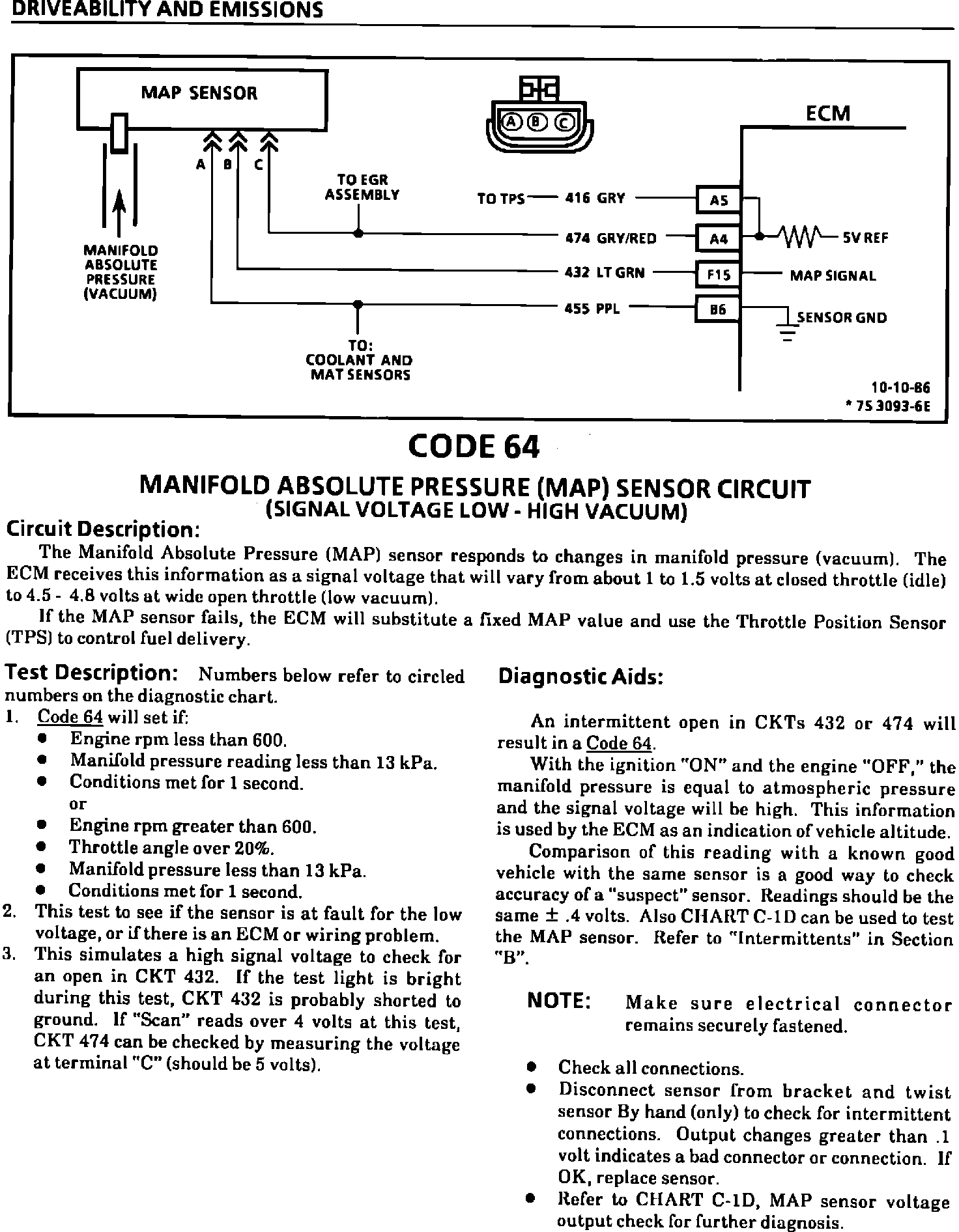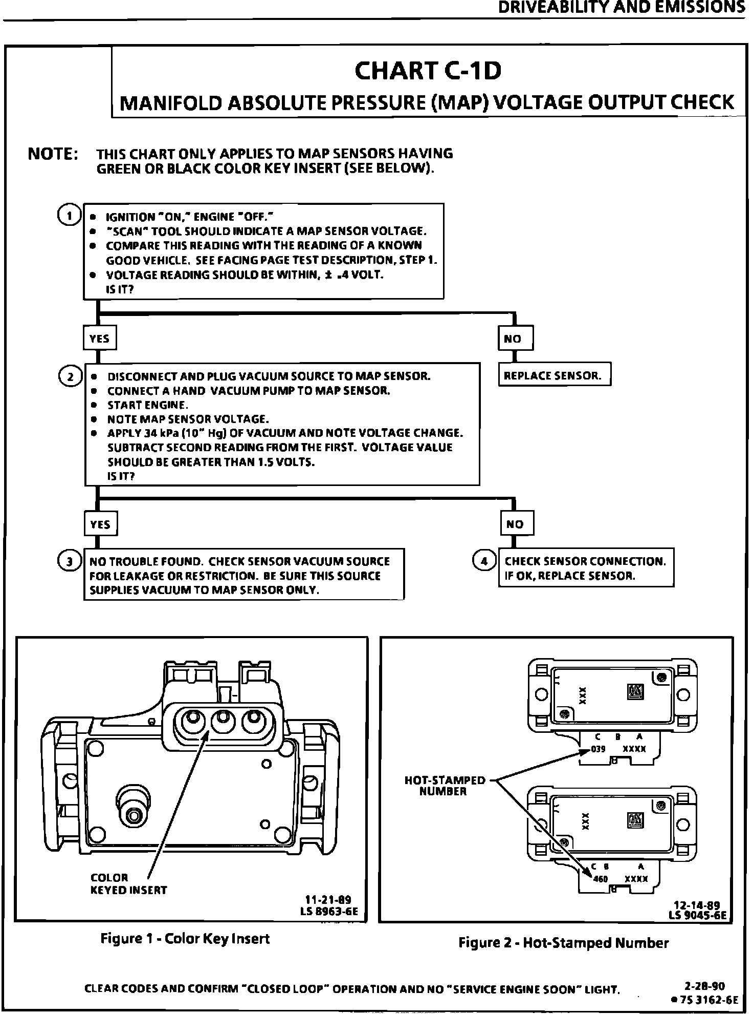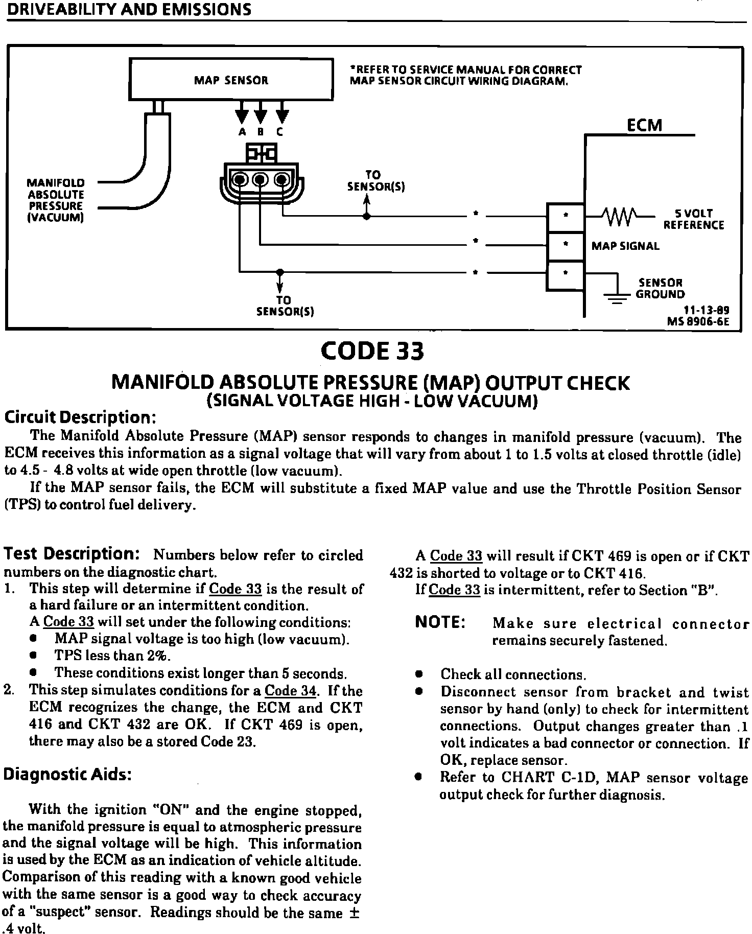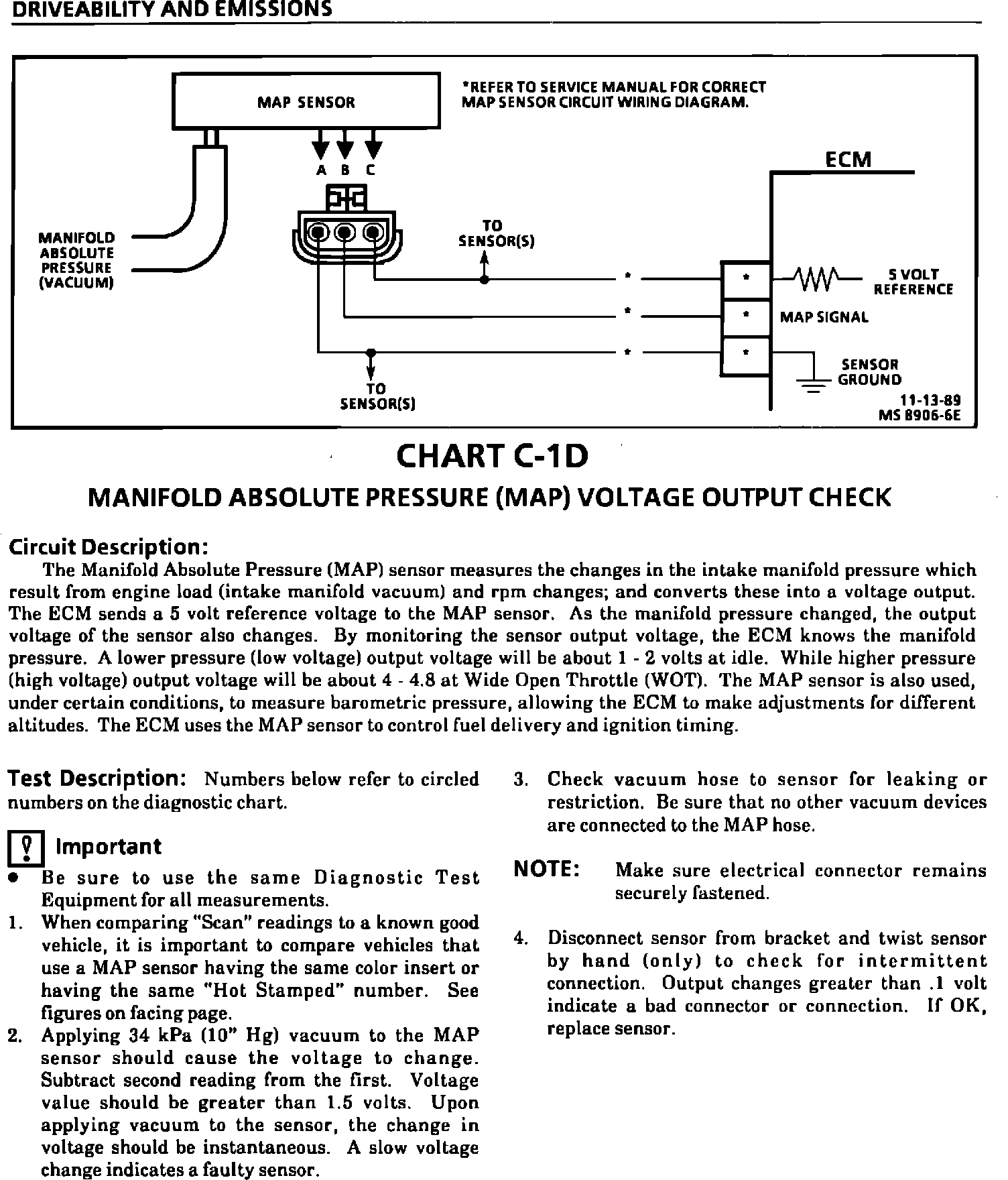 This bulletin revises the Manifold Absolute Pressure (MAP) Output Check Chart C-1D and updates Code 33, Code 34, Code 63, and Code 64 in the Service Manual sections on "Driveability And Emissions" (Section 6E1, 6E2, and 6E3). This information applies to all MAP Sensors on 1980-1990 vehicles with gasoline engines (except turbocharged) with green (standard) MAP sensor electrical connector insert or the solid black MAP sensor electrical connector insert.