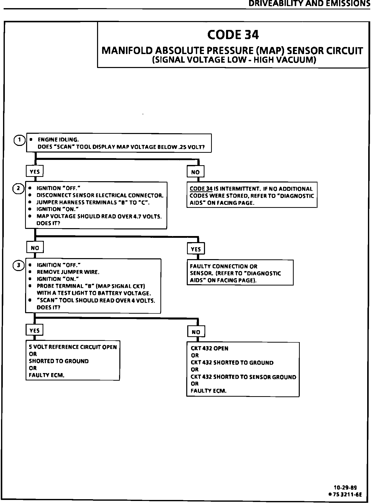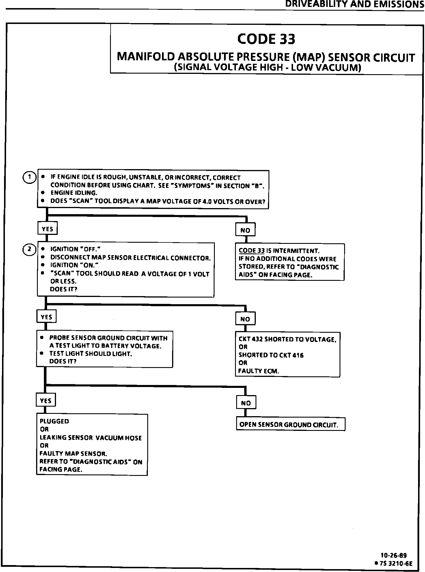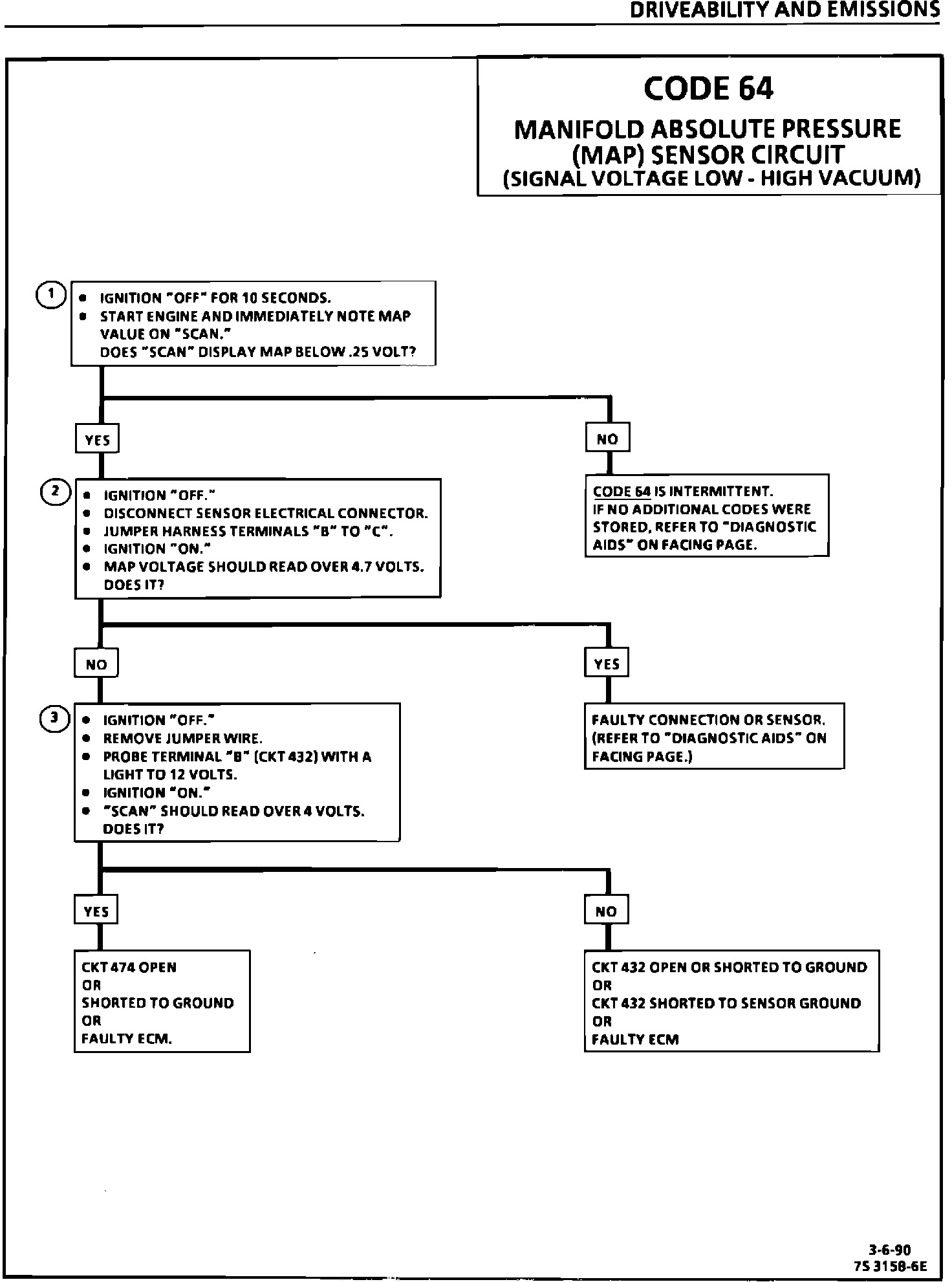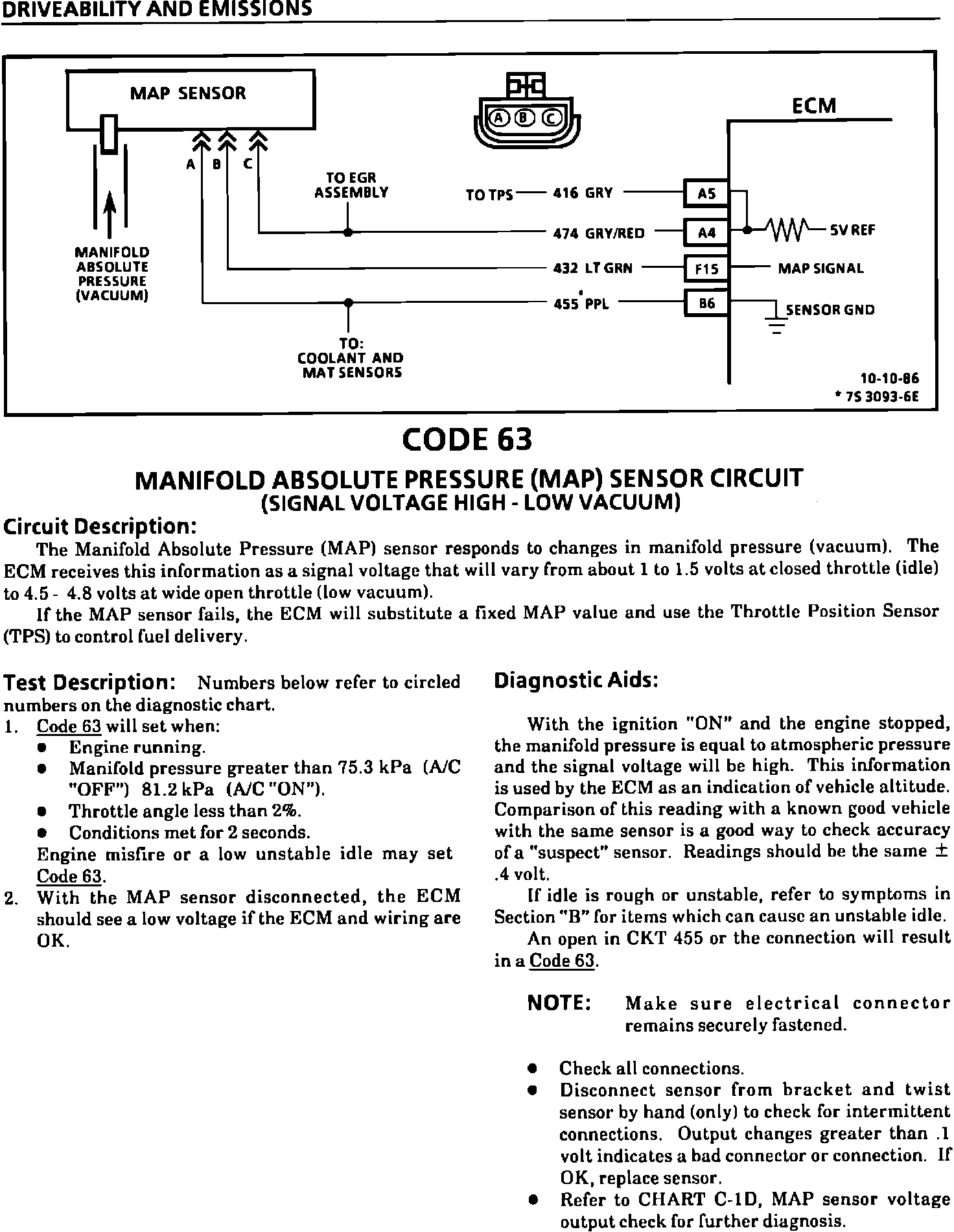 This bulletin revises the Manifold Absolute Pressure (MAP) Output Check Chart C-1D and updates Code 33, Code 34, Code 63, and Code 64 in the Service Manual sections on "Driveability And Emissions" (Section 6E1, 6E2, and 6E3). This information applies to all MAP Sensors on 1980-1990 vehicles with gasoline engines (except turbocharged) with green (standard) MAP sensor electrical connector insert or the solid black MAP sensor electrical connector insert.