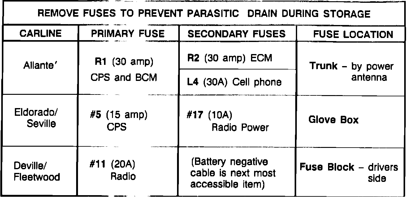 When disconnecting the negative battery cable is not practical for storage, Figure 1 can be used to determine which fuses should be pulled to minimize the parasitic drain. The "Primary" fuse should be pulled and placed in a location in the vehicle where sales and service personnel can easily find and reinstall it.