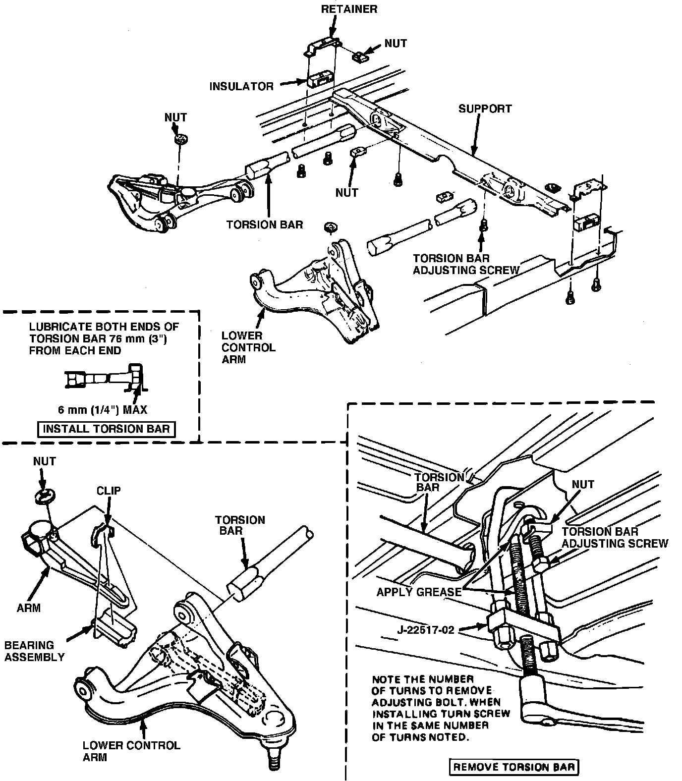 4. Reverse procedure to install. Torque torsion bar support retainer bolts to 20 ft. lbs.