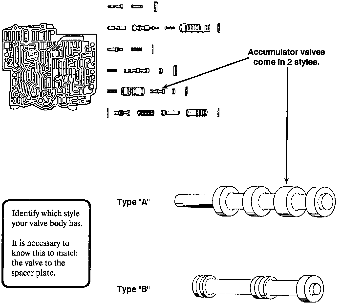 Do not attempt to "swap" valves to make a match. The springs and the aluminum bushings are also different. You can, however, switch the entire accumulator valve line-up including the spring, valve, & aluminum bushing, since there is no difference in the valve body casting in this area.