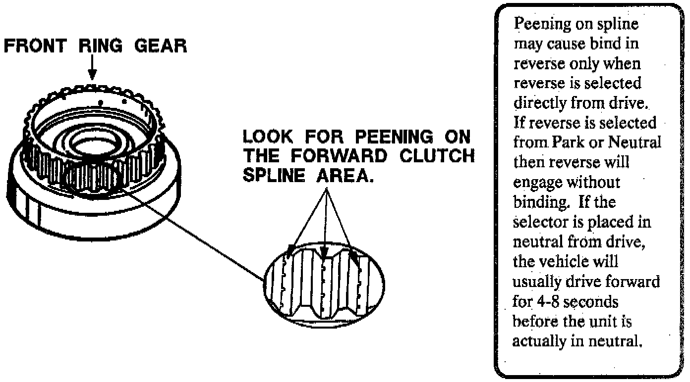 A momentary bind-up in reverse, and a slow release from drive (drives forward in neutral for 4-8 seconds) may be caused by the forward clutch teeth "peening" into the front ring gear, causing the clutches to become "stuck" applied.