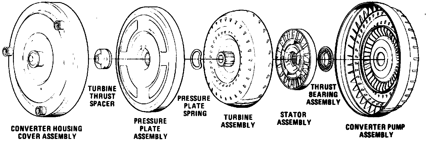 The converter clutch assembly, see image, provides a direct mechanical coupling of the engine to the transmission. The application and release of the converter clutch is determined b a series of controls and drive range section. Before assuming that converter clutch problems are electrical in nature, mechanical checks such as linkage adjustments and oil level should be performed and corrected, if necessary.