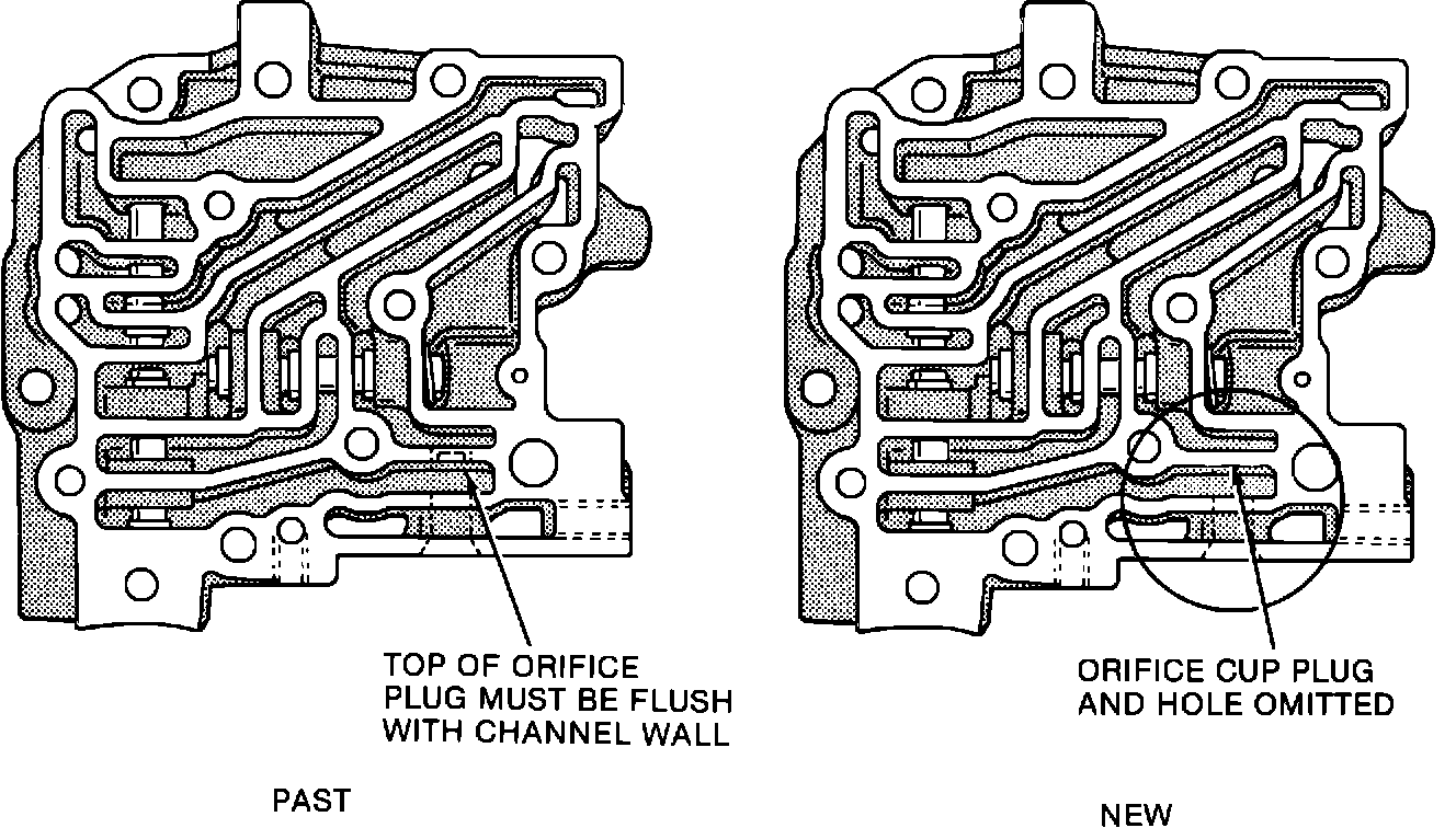 or an orifice cup plug in the auxiliary valve body cover. The auxiliary valve body cover was changed to a solid cover (no exhaust hole or orifice cup plug) in 1982. The service auxiliary valve body cover, part no. 8643645 should be used on all models to prevent shudder. The service part does not have an orifice cup plug.