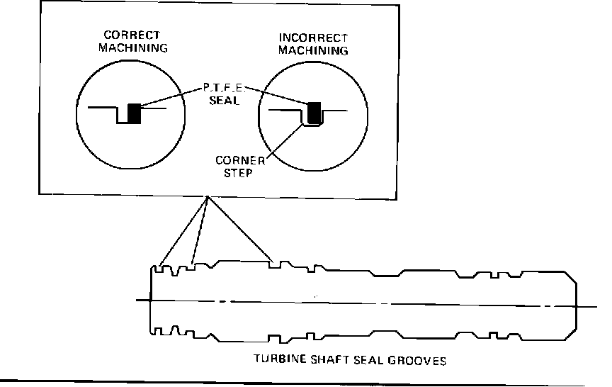 corners of the seal groove will keep the seal from contacting the side wall of the groove and will prevent proper sealing. See Fig. 6. If this condition is found, replace the turbine shaft and seals.