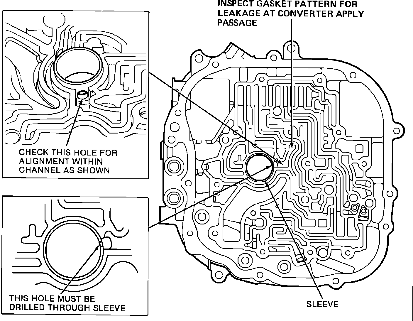 1. If the transaxle being serviced has the auxiliary valve body with the orifice cup plug, particles of the auxiliary valve body cover gasket may have torn loose. This material may be sticking the torque converter clutch apply valve and/or plugging the converter release orifice in the control valve body spacer plate. If this is found, disassemble the auxiliary valve body and thoroughly clean. Also, be sure to remove any gasket particles in the valve body spacer plate converter release orifice hole and replace the auxiliary valve body cover gasket, part no. 8653947.