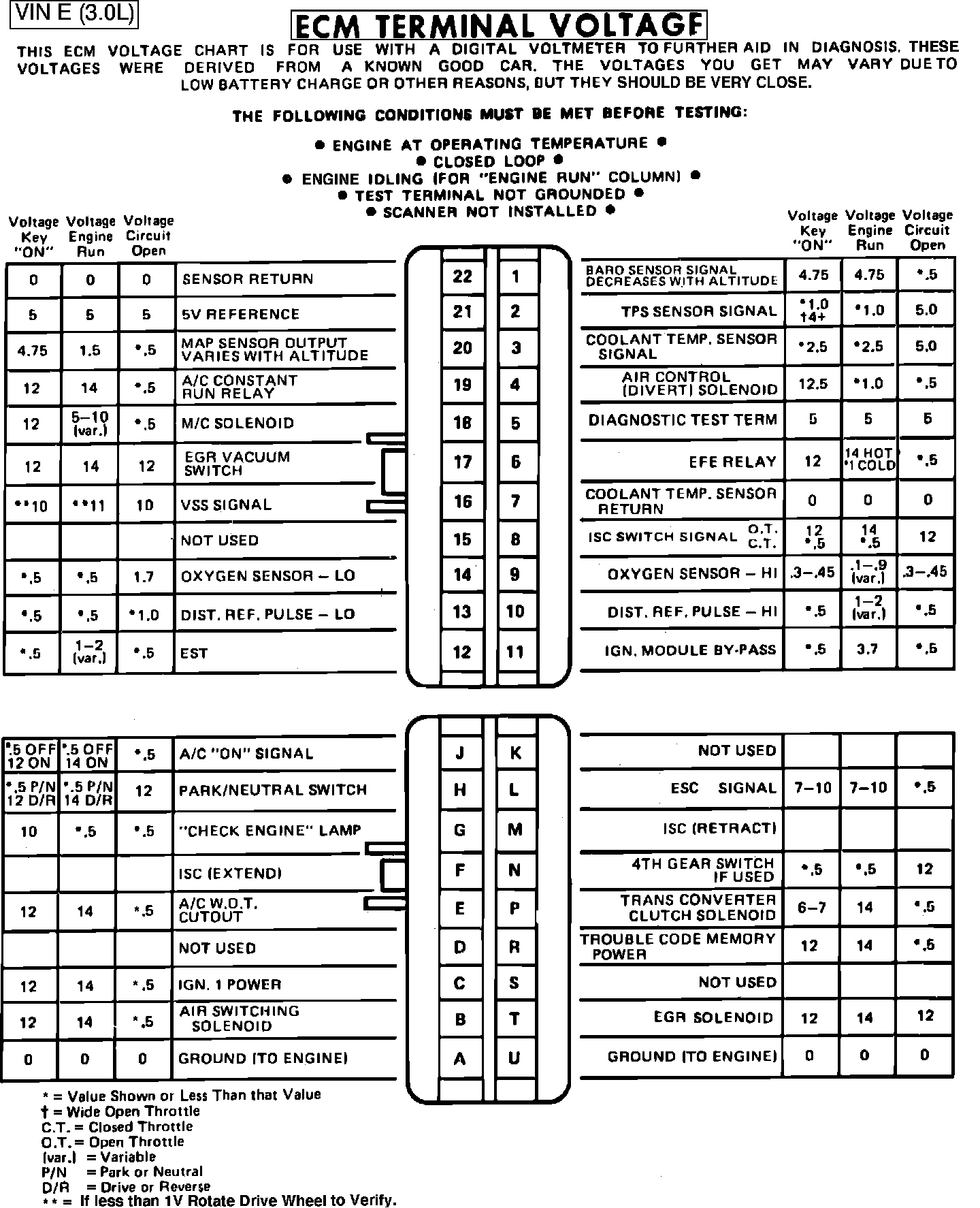 Fig. 021 - ECM Connector Terminal Identification & Voltage Specifications.: