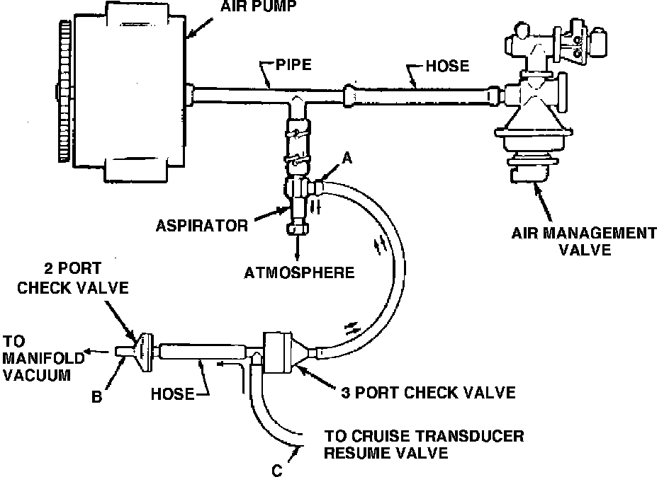The aspirator assisted vacuum system supplements engine vacuum when engine vacuum is low. The system, Fig. 11, consists of an aspirator, 3-Port check valve, 2-Port check valve and related components such as the air pump and air management valve. The air for the aspirator is tapped off the air line that connects the air pump to the air management valve. Aspirator vacuum and manifold vacuum (after passing through the 2-Port check valve) supply the two upper ports of the 3-Port check valve. The lower of the 3-port check valve supplies air to the cruise control transducer. The aspirator assisted vacuum system operates as follows: