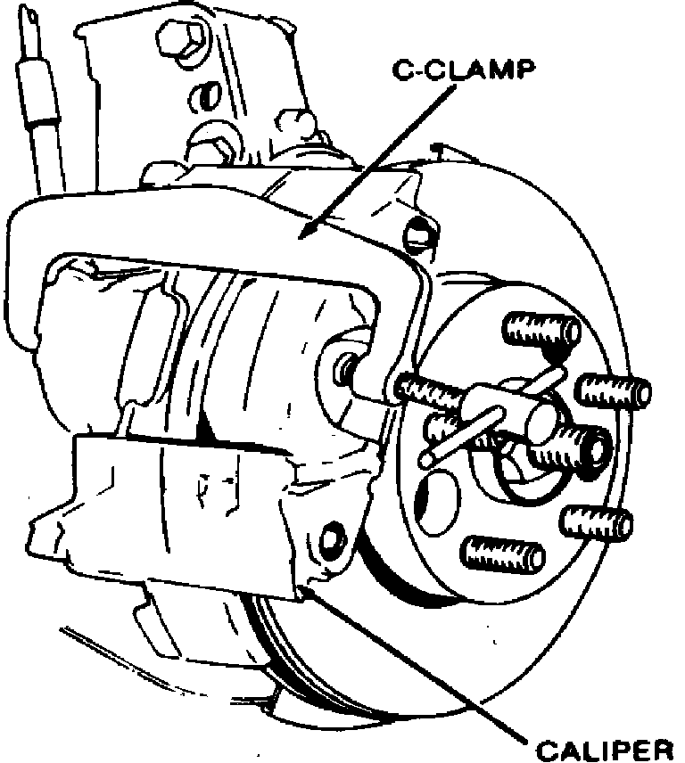 3. On 1982-83 models except Chevette, position C-clamp as shown in Fig. 5, tighten C-clamp until piston bottoms in piston bore, then remove C-clamp.