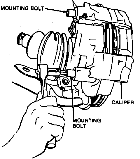 7. Remove caliper assembly from disc. If only shoe and lining assemblies are to be replaced, using a length of wire suspend caliper from spring coil. Never allow caliper to hang from brake hose.