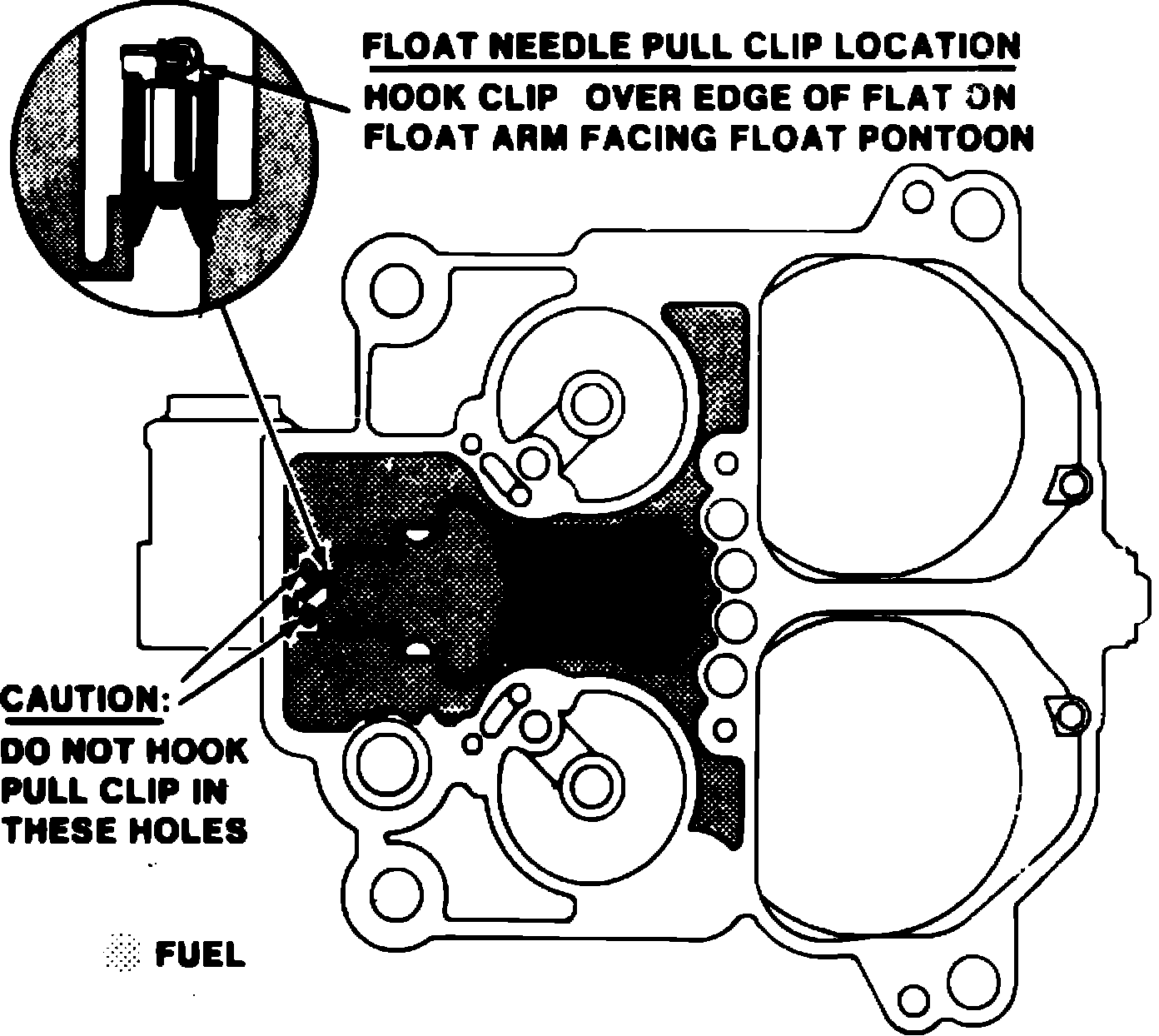 23. Install float hinge pin into float arm with end of pin loop facing pump well. Then, install float assembly by aligning needle in seat and float hinge pin into locating channels in float bowl. Do not install float needle pull clip into holes in float arm since flooding may result.