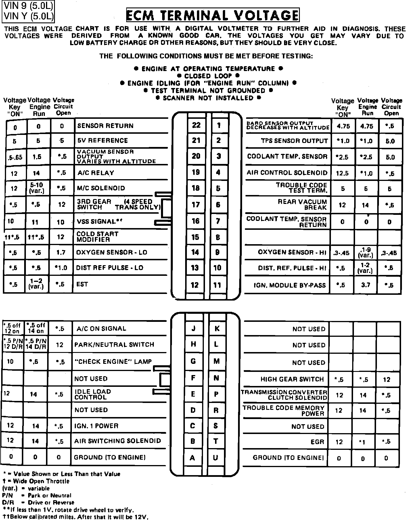 Fig. 010 - ECM Connector Terminal Identification & Voltage Specifications.: