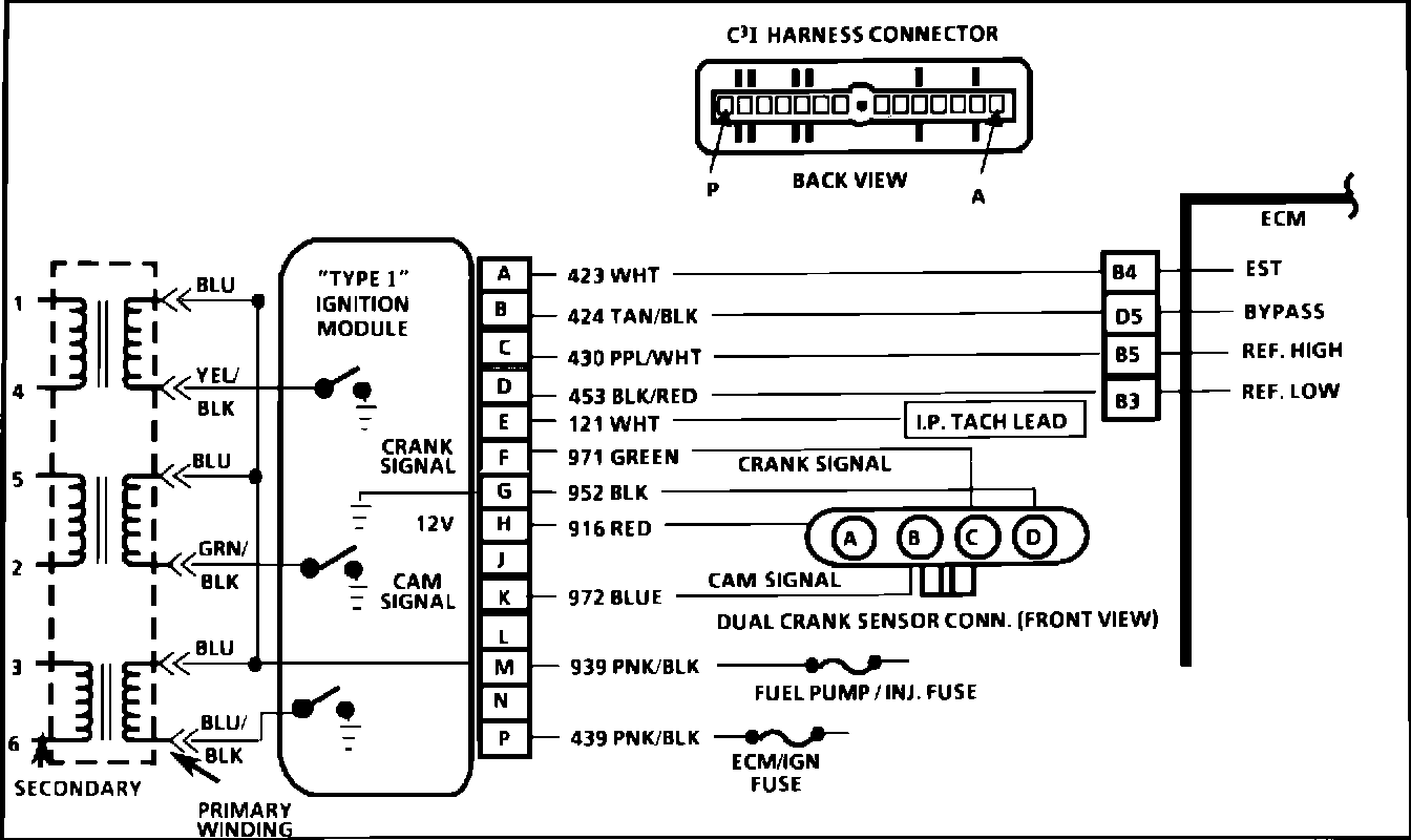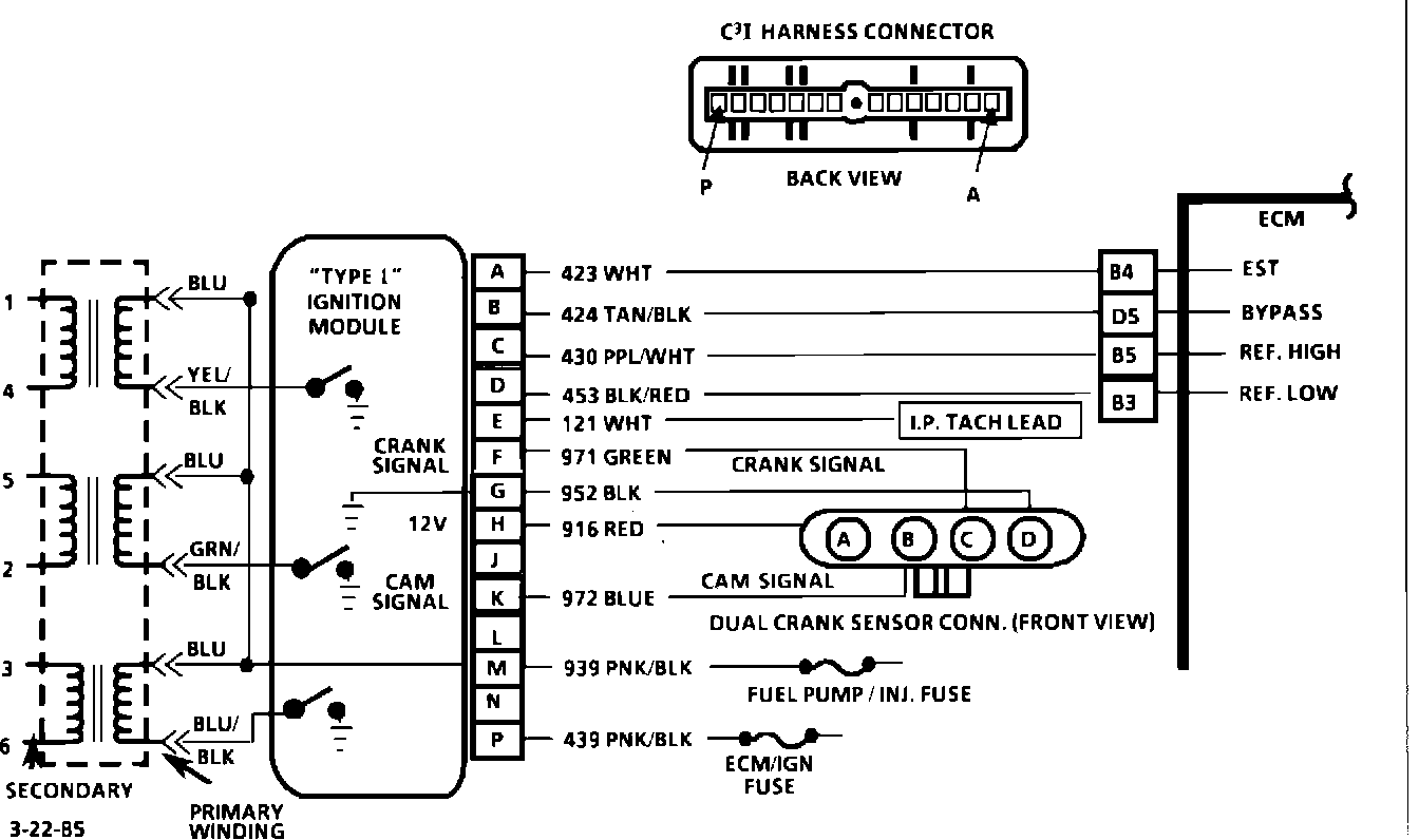 7. This voltage is supplied by the module and is pulled low by the sensor each time a window in a rotating disc is aligned with one of the "hall effect" switches. This results in a "crank" or "cam" signal as measured at the ignition module.