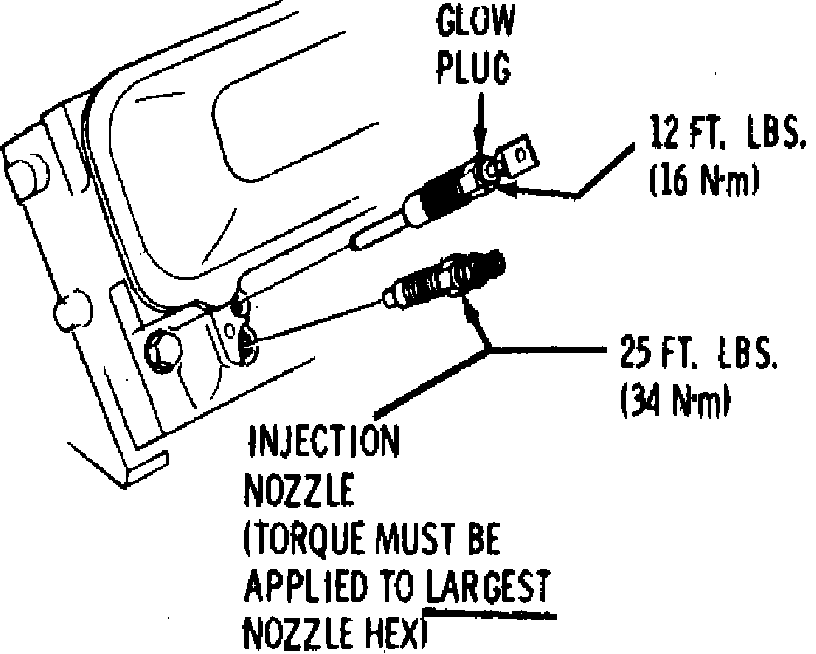 4. Reverse procedure to install. Torque nozzle to 25 ft. lbs. When tightening nozzle, torque must be applied to largest nozzle hex. Torque fuel line to 25 ft. lbs. using a back-up wrench on upper injection nozzle hex.