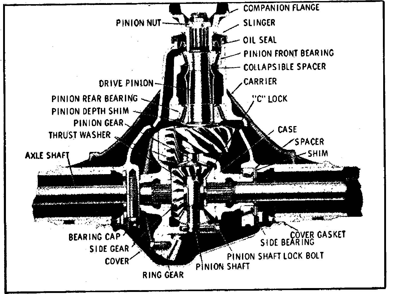 As shown in Fig. 2, the drive pinion is mounted on two tapered roller bearings that are preloaded by two selected spacers. The drive pinion is positioned by shims located between a shoulder on the pinion and the rear bearing. The front bearing is held in place by a large nut. The differential is supported in the carrier by two tapered roller side bearings. These are preloaded by inserting shims between the bearings and the pedestals. The differential assembly is positioned for ring gear and pinion backlash by varying these shims.
