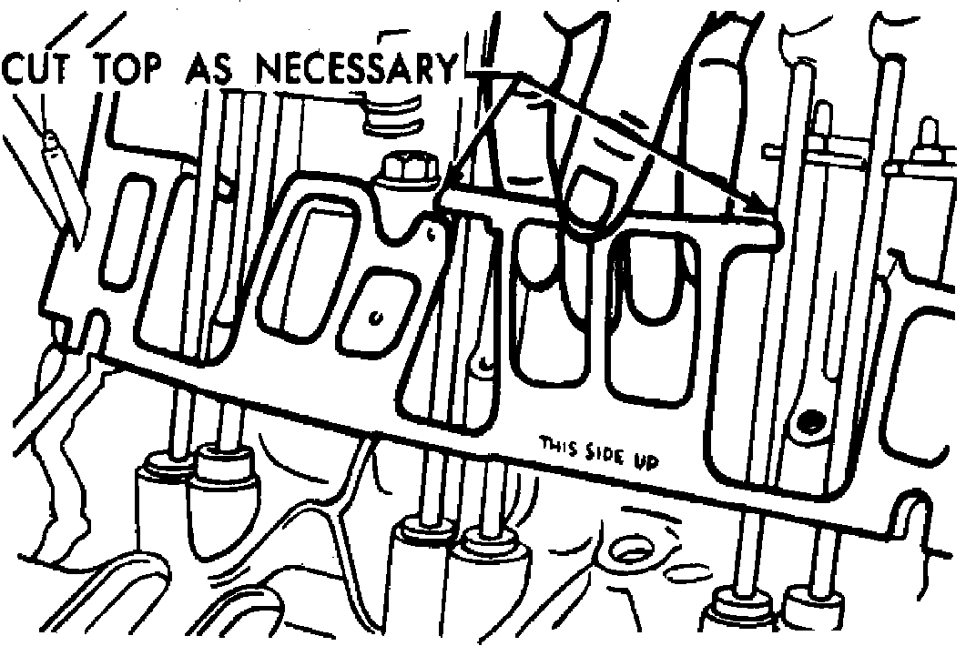 c. Install new intake gaskets on cylinder heads, holding in place by extending ridge sealant bead up 6 mm onto onto gasket ends. On 1982---86 models new intake gaskets will have to be cut where indicated, Fig. 4, to install behind push rods. Cut only those areas that are necessary.