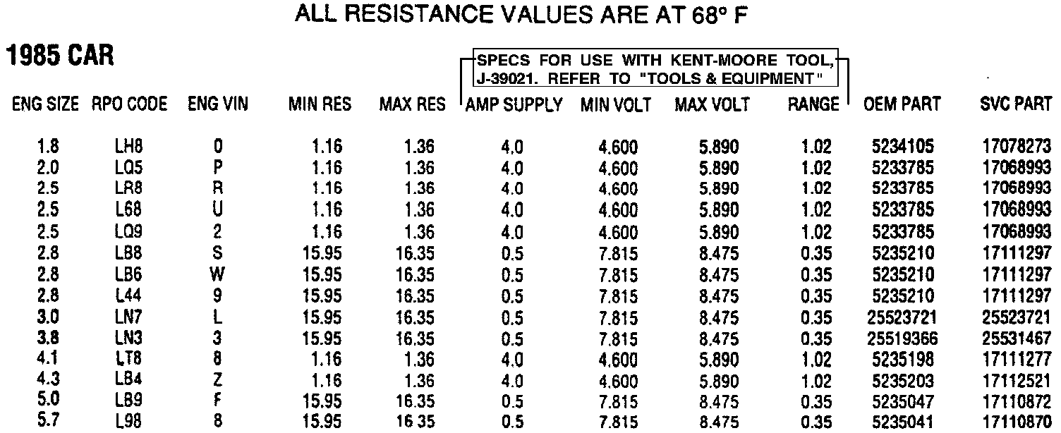Injector Resistance, Application Chart & J-39021 Tester Values