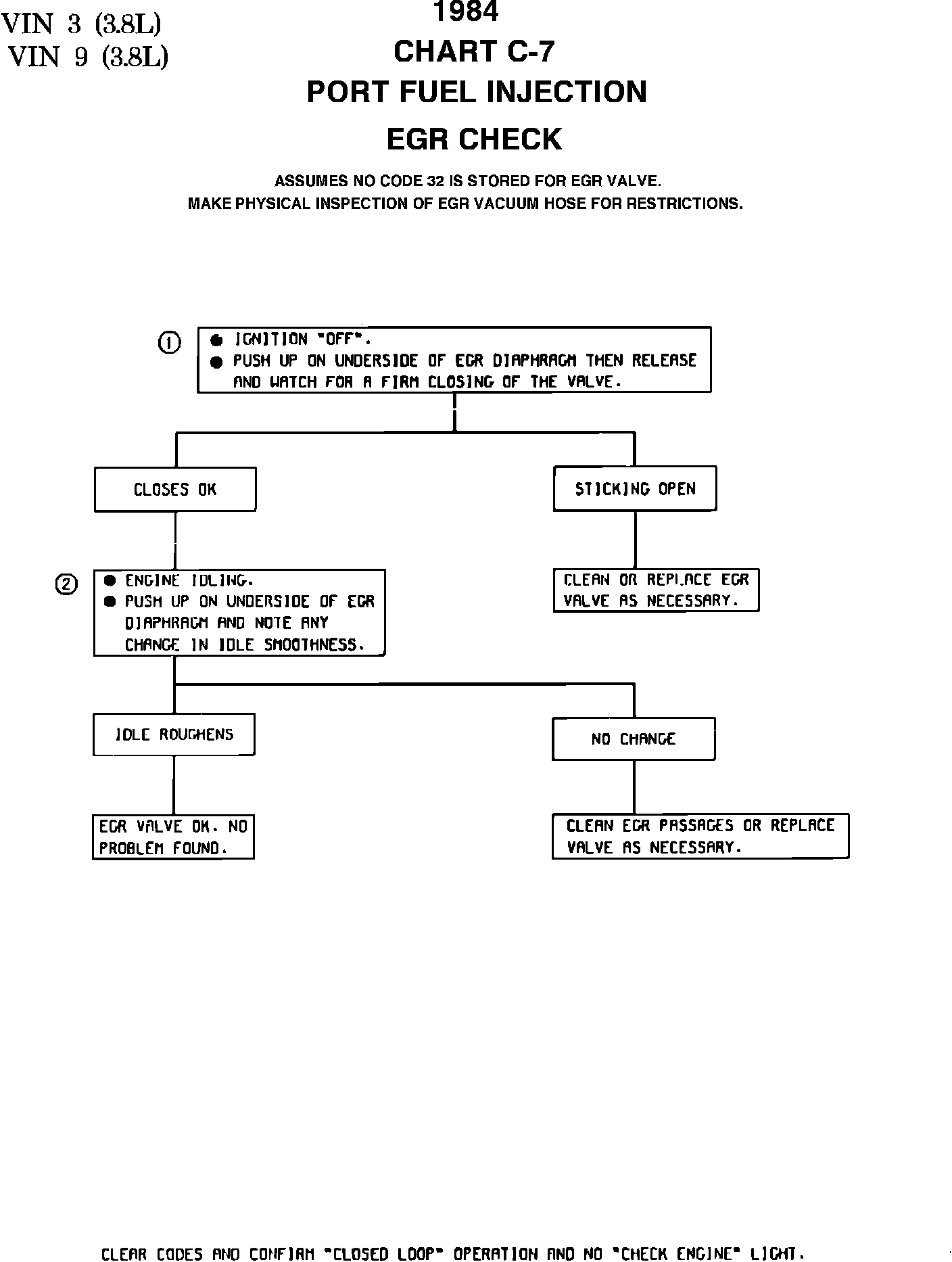 The EGR valve is controlled by a normally closed solenoid (allows vacuum to pass when energized). The ECM energizes the solenoid to turn the EGR on, and monitors vacuum to the EGR with the EGR diagnostic switch. Any EGR problem caused by the control solenoid, vacuum switch, wiring, or a vacuum leak will be detected by the ECM, and failure Code 32 will be set. Chart C-7 checks for two problems; plugged EGR passages, or a sticking EGR valve.