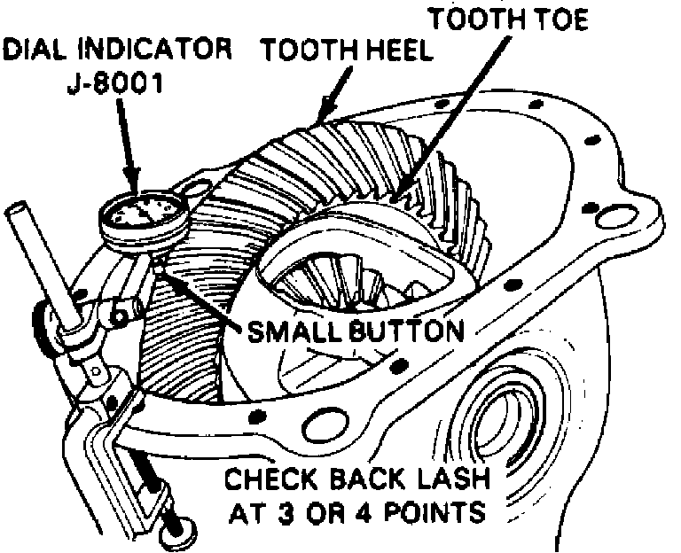 8. Check ring gear and pinion backlash at several positions, holding pinion while rocking gear back and forth, and record readings. If a variation greater than 0.002 inch is recorded, check for burred gears, improperly installed ring gear or distorted differential case, and correct as needed.