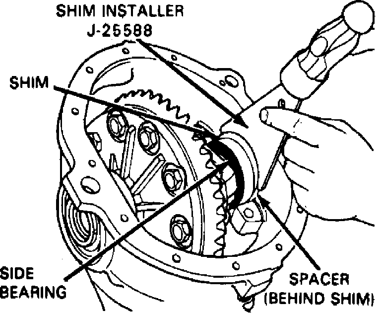 3. Insert progressively larger feeler gauges between shim and service spacer until there is a noticeable increase in drag, Fig. 7. Original light drag is caused by weight of case against housing, while additional drag is caused by side bearing preload. By starting with smaller gauges, a sense of ``feel'' is obtained so that the beginning of preload can be recognized to obtain zero preload. Total shim thickness needed to obtain zero preload is equal to the thickness of feeler gauge used just before noticeable drag is felt plus the thickness of shims installed in step 2.
