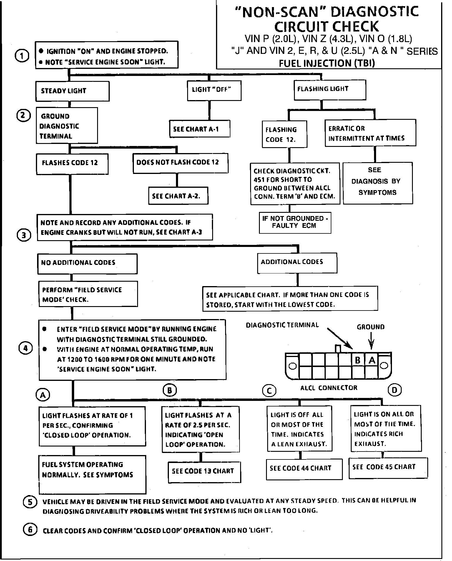 4. If no additional codes were recorded, see DIAGNOSIS BY SYMPTOM for driveability symptoms and recommended service procedures. Depending on the severity of the problem, the `Field Service Mode' may be helpful in diagnosis.