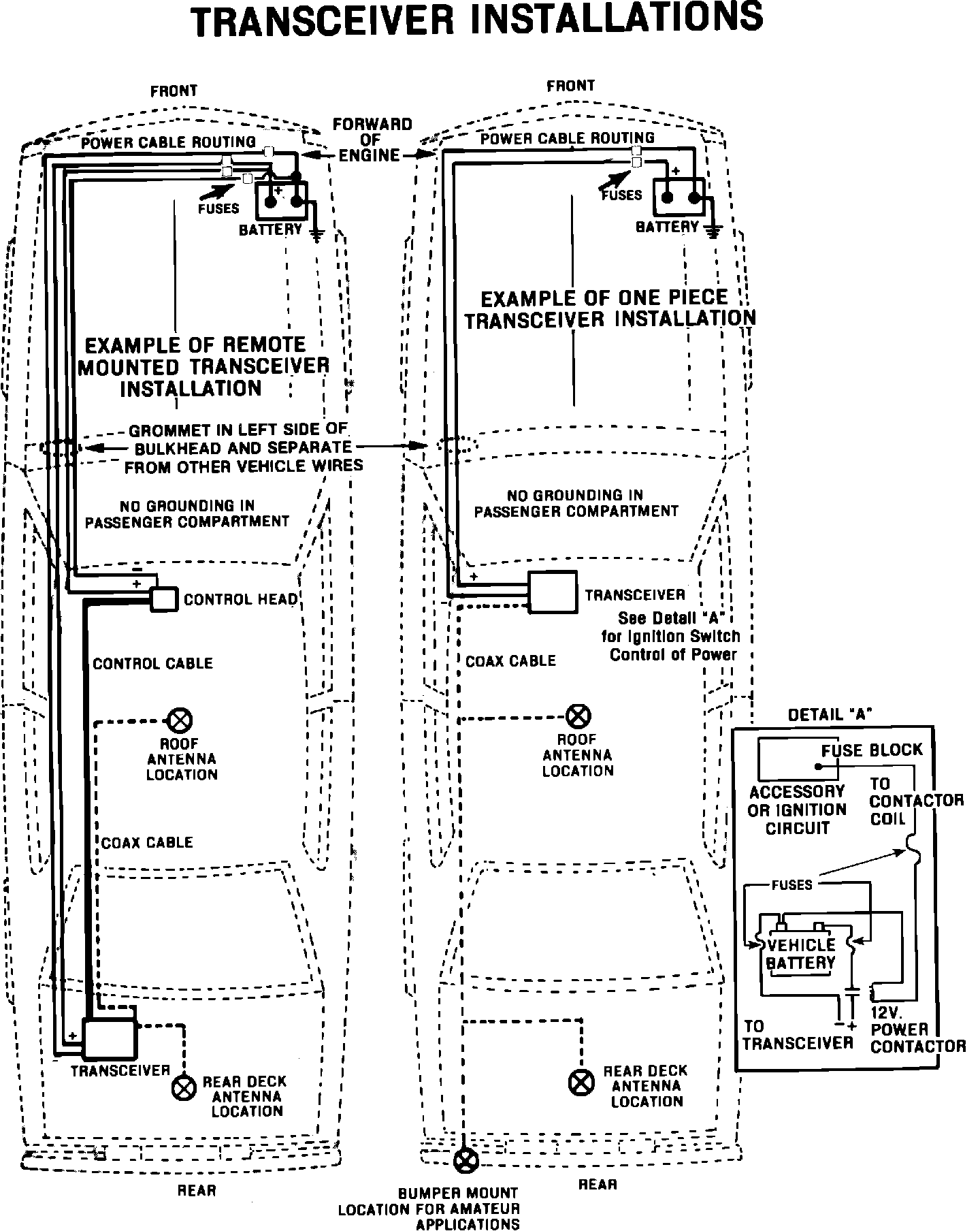 It is recommended that a fuse be placed in the transceiver ground lead to prevent possible damage to the transceiver, in the event the battery to engine-block ground is inadvertently disconnected. For ONE-PIECE TRANSCEIVERS where ignition switch control is desired, a 12 v power contactor must be installed in the transceiver positive lead. The contactor should be located at the vehicle battery with the coil of the contactor driven through an appropriate in-line fuse from an available accessory circuit or ignition circuit not powered during cranking. The coil of the contactor must return to battery negative.