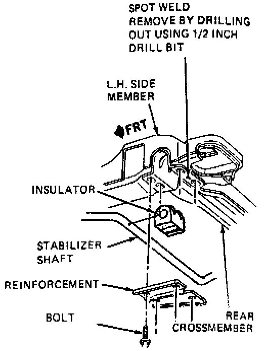 h. Using a 1/2 inch drill bit, drill through spot weld located between rear holes of left stabilizer bar mounting, Fig. 4.