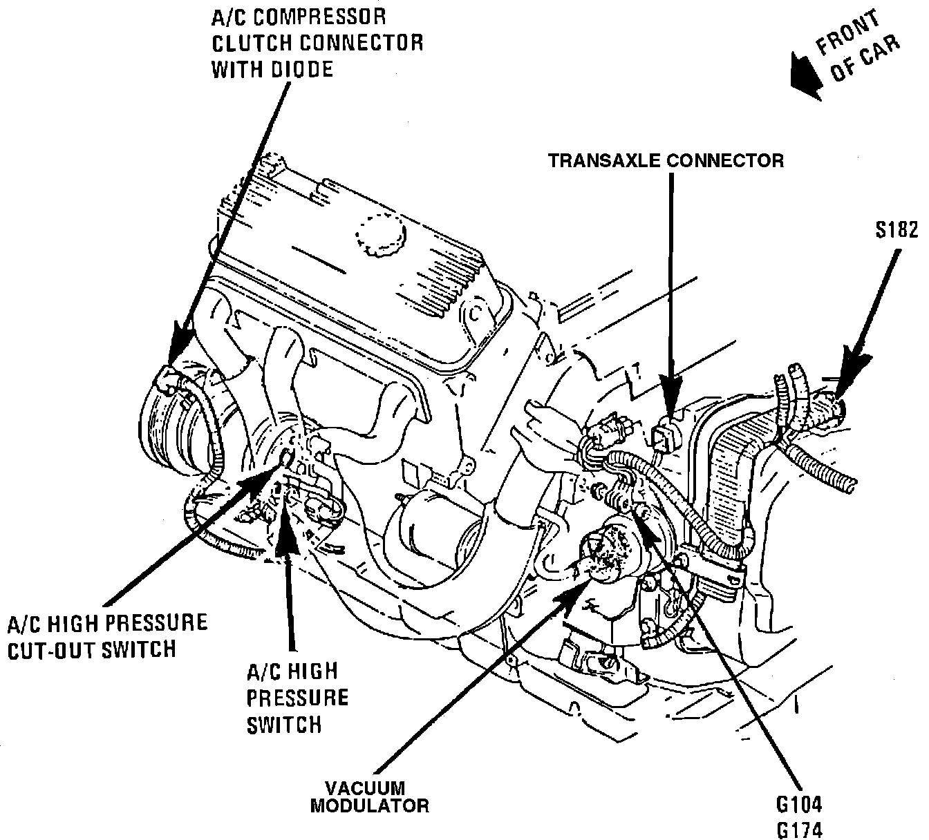 The A/C High Pressure Switch is located on the RH front of engine, rear of A/C compressor.