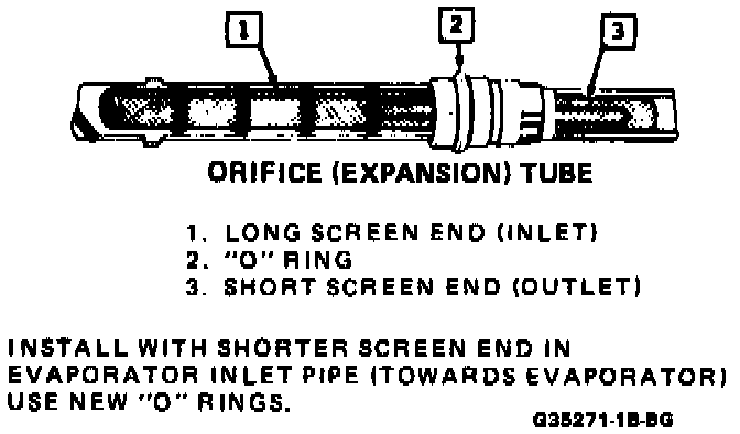 The plastic tube, with its mesh screen and orifice, is located in the evaporator inlet pipe at the liquid line connection. It provides a restriction to the high pressure liquid refrigerant in the liquid line, metering the flow of refrigerant to the evaporator as a low pressure liquid. The orifice tube is protected from contamination by filter screens on both inlet and outlet sides. The tube may be cleaned of any metal particles that collect on the screens or the tube should be replaced. No repairs can be made to the orifice tube.