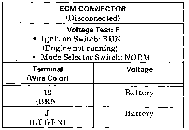 ^ If the voltage at terminal 19 is incorrect, check for an open in the BRN (449) wire. If wire is OK, replace the A/C Compressor Control Relay.