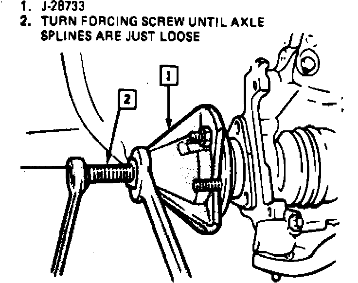 6. Mount tool J-28733 or equivalent on hub , Fig. 4, and tighten screw just enough to separate drive axle from hub.