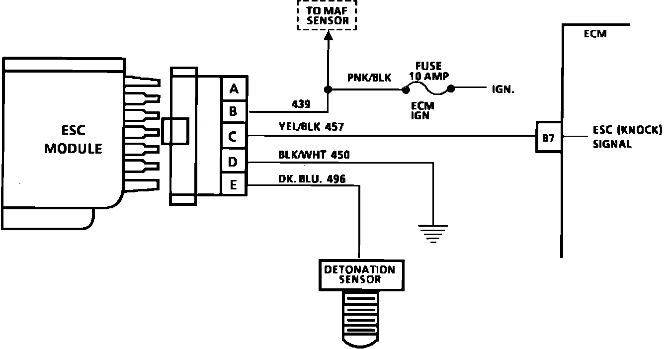 2. By disconnecting the ESC module, the ECM monitors a low voltage at terminal B7 and should retard the ignition timing.