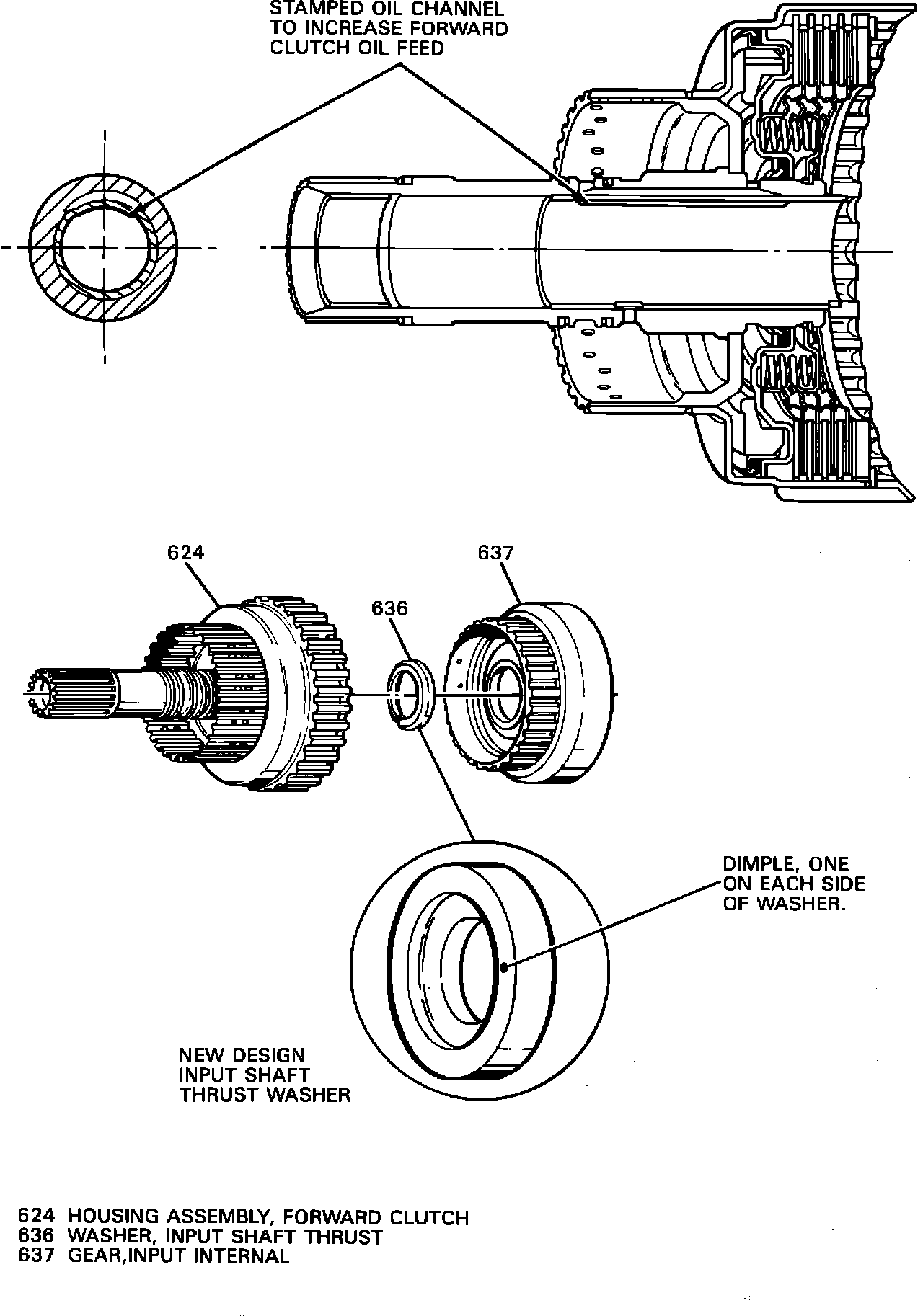 A new forward clutch housing and thrust washer. (Refer to Items 624 and 636 Figure 1.) This new forward clutch housing contains a stamped channel which increases forward clutch feed providing a shorter neutral to drive engagement.