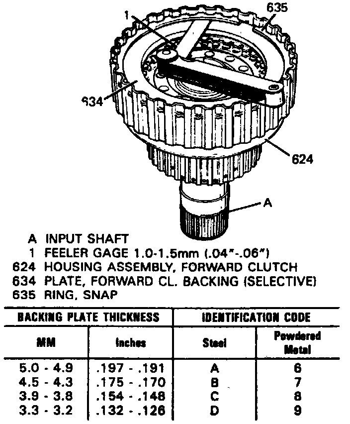 26. Install forward clutch backing plate snap ring, then measure endplay as shown in images. If endplay is not between .040-.060 inch, refer to images for correct backing plate selection.