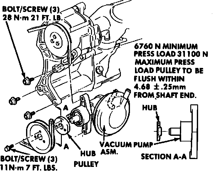 The belt-driven vacuum pump is serviced as an assembly only. Refer to Fig. when replacing the vacuum pump. On models equipped with V6-181 engine, the vacuum pump pulley must be replaced whenever the vacuum pump is removed.