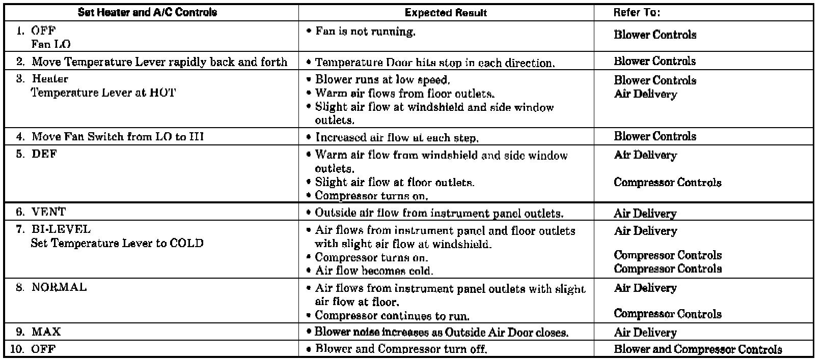 This provides an overall check of the Heater and Air Conditioning System. All of the functions can be performed without the use of tools or disassembly. For diagnosis of other results not in the System Check Table, refer to Testing and Inspection under the appropriate system / component.