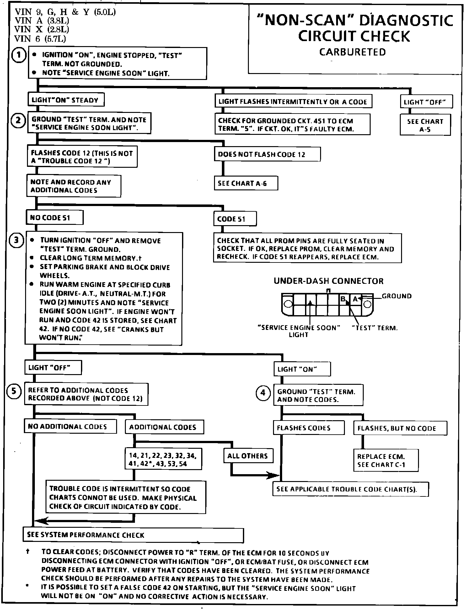 2. Grounding the test terminal will flash a Code 12 and any stored trouble codes. The light must go "ON" and "OFF", for a proper code. If the light goes from "bright" to "dim", this is not considered a code. See CHART A-6, in that case.