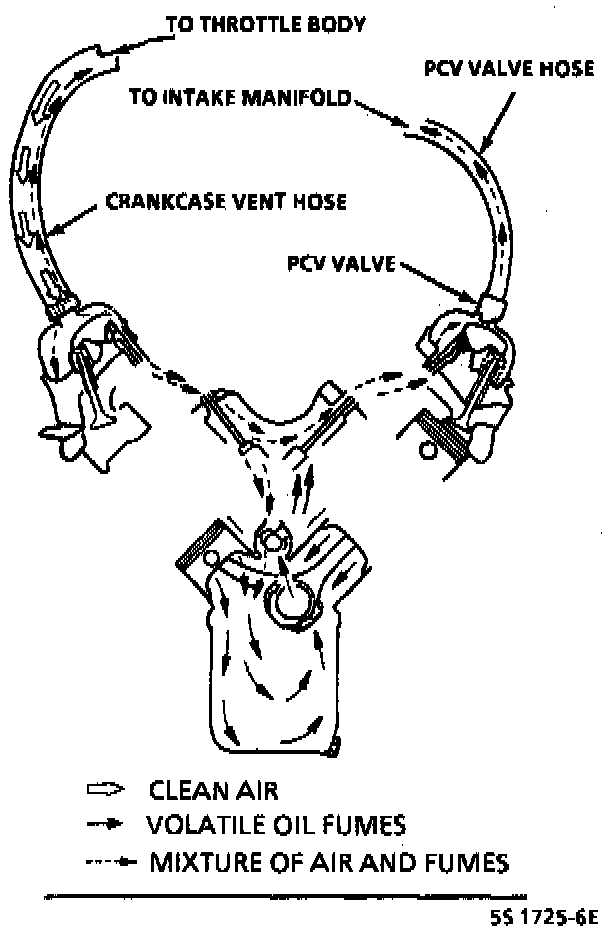 The Positive Crankcase Ventilation ([1][2]PCV) system is used to provide more complete scavenging of the crankcase vapors. Fresh air from the air cleaner is supplied to the crankcase, mixed with blow-by gasses,and then passed to the intake manifold.