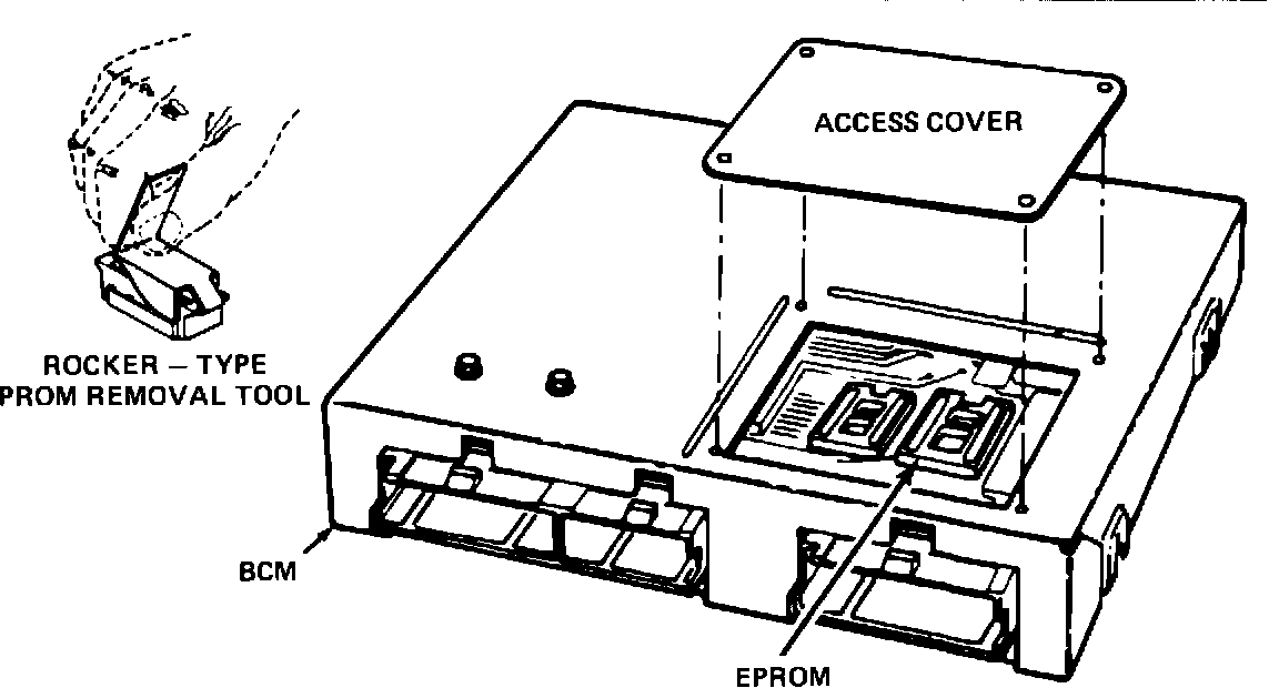 10. Remove EPROM as follows: Using the rocker type PROM removal tool (Figure 8), engage one end of the EPROM carrier with the hook end of the tool. Press on the vertical bar end of the tool and rock the engaged end of the EPROM carrier up as far as possible. Engage the opposite end of the EPROM carrier in the same manner and rock this end up as far as possible. Repeat this process until the EPROM carrier and the EPROM are free of the EPROM socket.