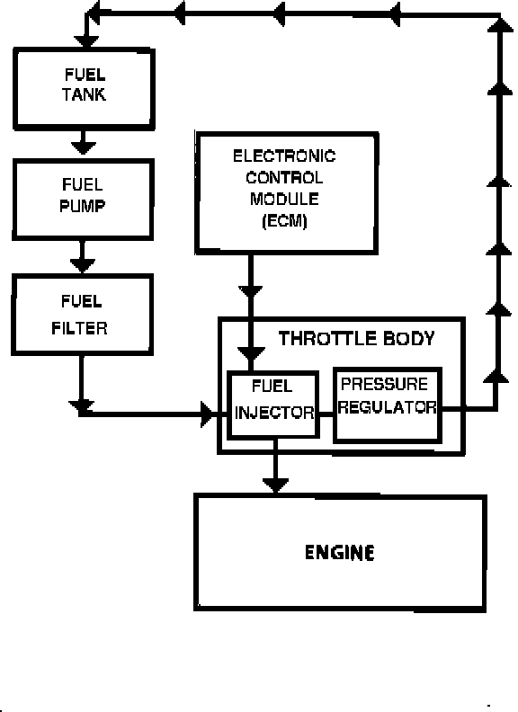 The fuel supply system begins with gasoline in the fuel tank. An electric fuel pump, located in the fuel tank with the fuel level gauge sending unit, pumps fuel to the throttle body through an in-line filter. The pump is designed to supply fuel at a pressure above the pressure needed by the injectors. A pressure regulator located in the throttle body assembly keeps the fuel available to the injectors at a constant pressure. The unused fuel is returned to the fuel tank by a separate line.