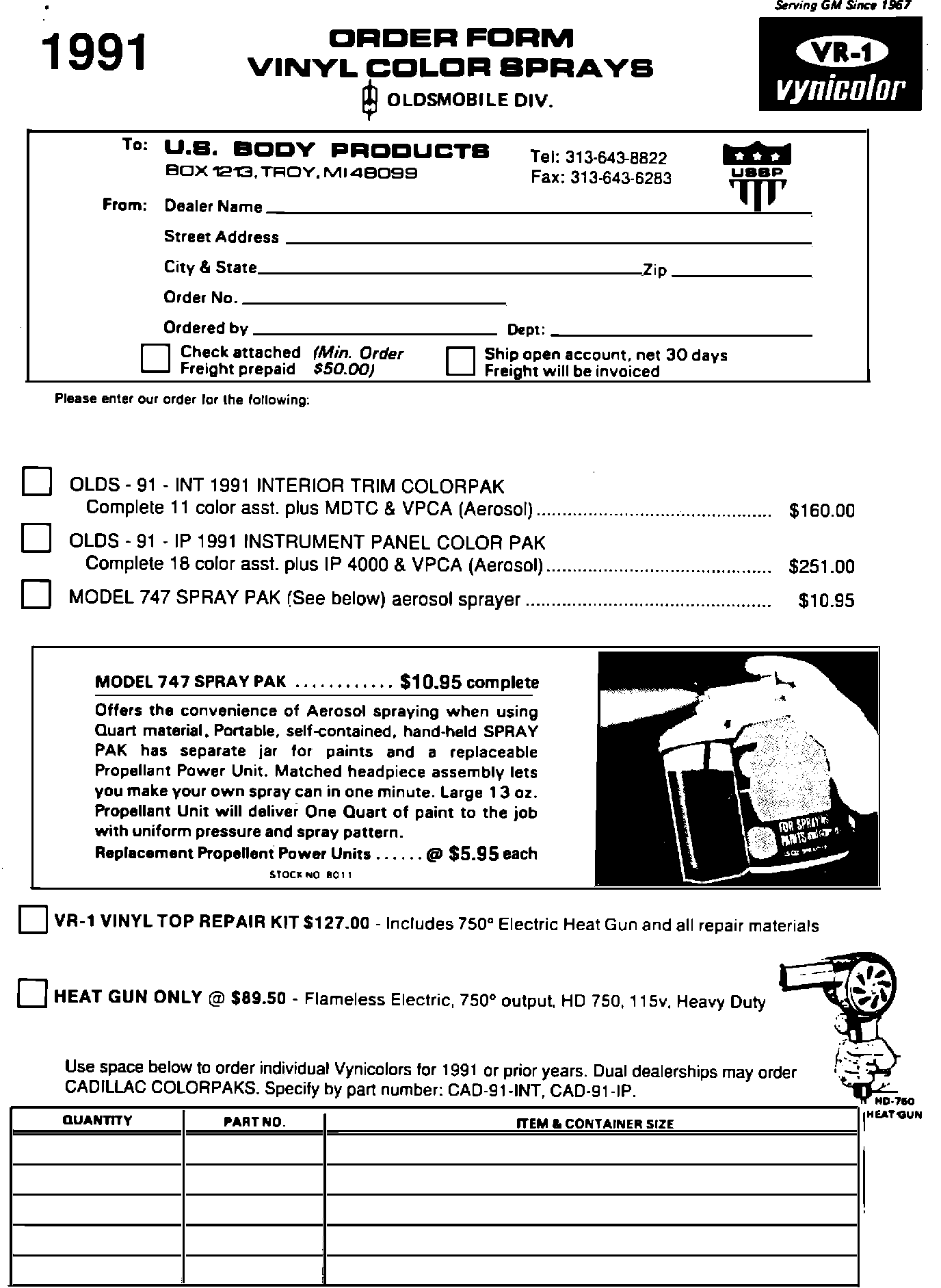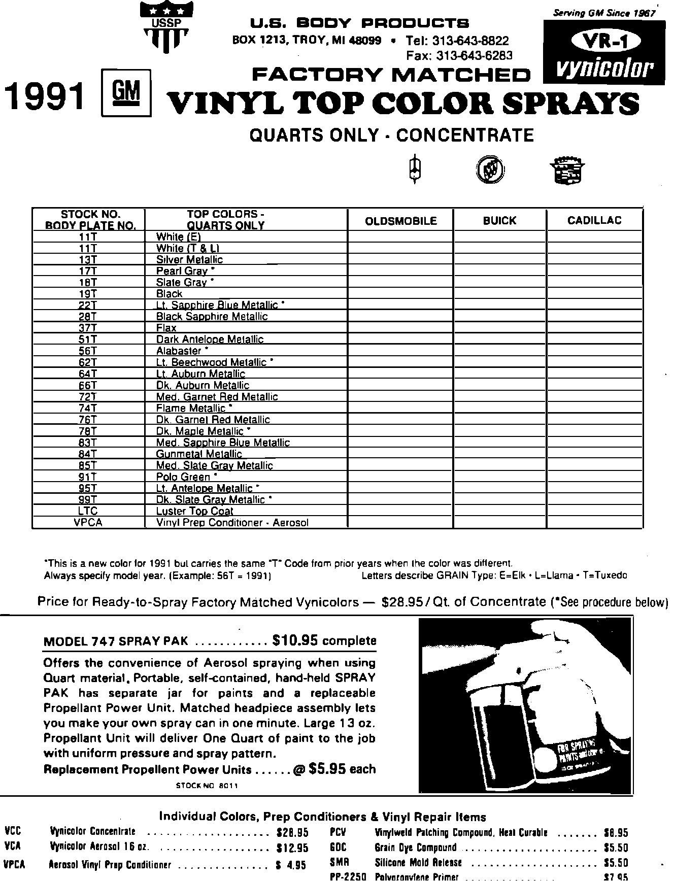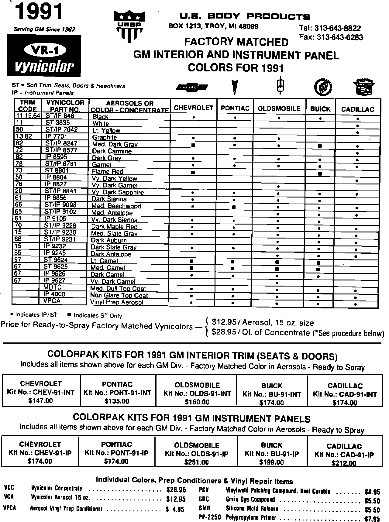 Their address is: P.O. Box 1213, Troy, Michigan 48099. Telephone (313) 643-8822. They will advise you of the availability of the material and will ship the material directly to your dealership pre-paid at your request. When contacting U.S. Body Products directly, give them the name of your local distributor so that they may follow-up in assisting the local supplier with your future needs.