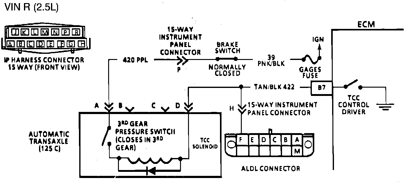 Fused ignition voltage is supplied to the TCC solenoid through the brake switch and transaxle third gear apply switch. The ECM will engage TCC by grounding CKT 422 to energize the solenoid.