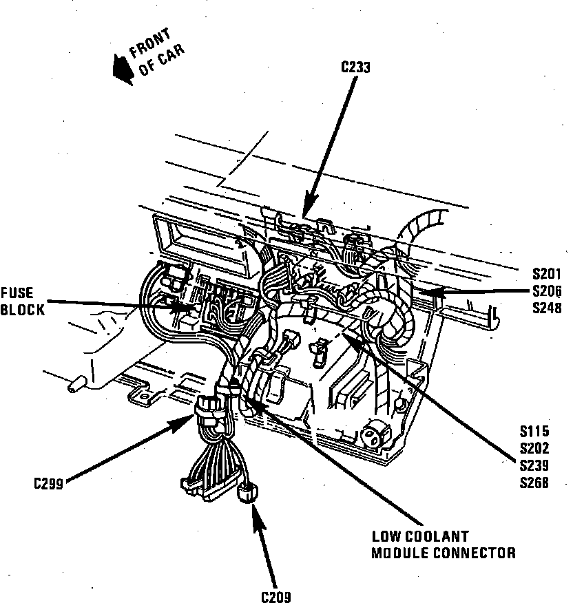 The Low Coolant Module is located behind RH side of I/P.