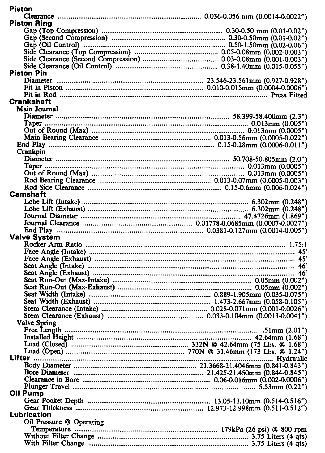 Continued Engine Specifications: