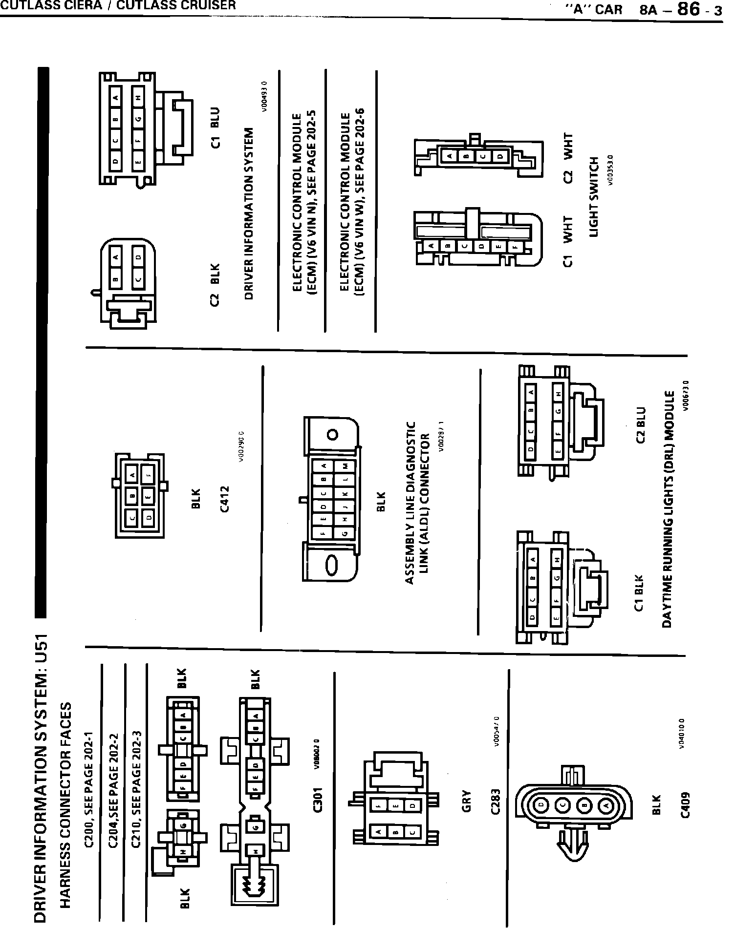 Pages 8A- 86-1 and 8A- 86-3 contain incorrect wiring harness connector information for the Driver Information System. These pages have been corrected and are reproduced as part of this bulletin. Please mark references to this bulletin on the above pages in your 1989 Cutlass Ciera and Cutlass Cruiser Service Manual.