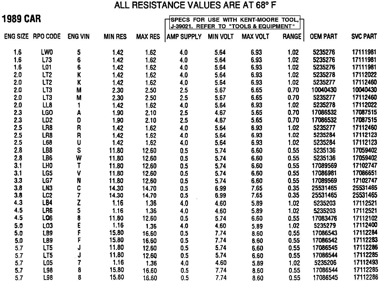 Injector Resistance, Application Chart & J-39021 Tester Values
